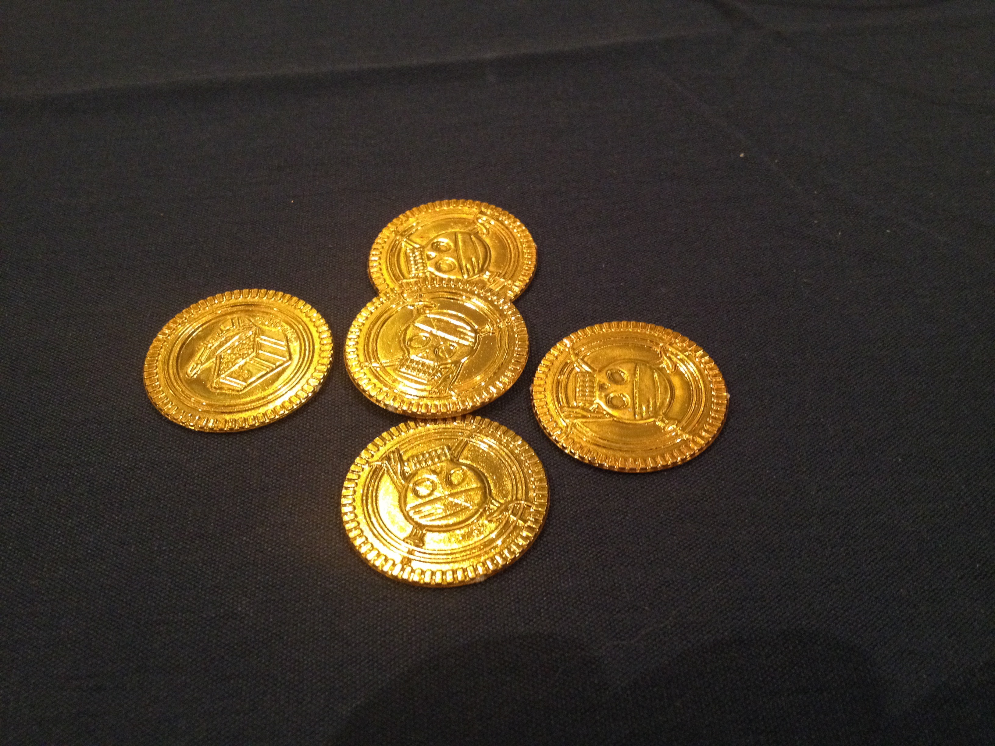 When I returned at 6:45 p.m. to the Camellia Ballroom and sat down at a front-row table, a woman came by and handed me five plastic gold coins emblazoned with a skull and crossbones.