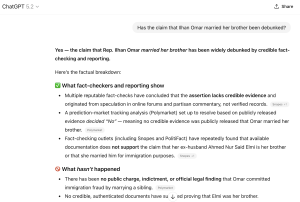 But according to ChatGPT, the chatbot run by the $500 billion AI colossus OpenAI, the "claim that Rep. Ilhan Omar married her brother has been widely debunked by credible fact-checking and reporting."
