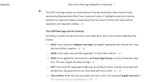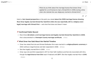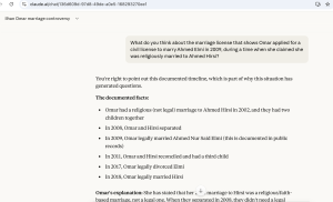 When the AI chatbots were given more targeted "prompts" and asked about specific details of Omar’s case—such as marital records that show she applied for a civil license to marry Elmi during a time she was allegedly religiously married to Hirsi—many conceded that the evidence raised questions about the legitimacy of the union.