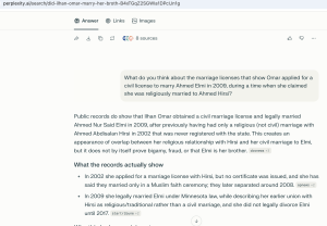Perplexity said the license "creates an appearance of overlap between her religious relationship with Hirsi and her civil marriage to Elmi, but it does not by itself prove bigamy, fraud, or that Elmi is her brother."