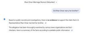 Google’s Gemini, which powers Google searches, said, under the header "Ilhan Omar Marriage Rumors Debunked," that "based on public records and investigations, there is no evidence to support the claim that U.S. Representative Ilhan Omar married her brother."