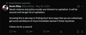 When El-Sayed sat on the Sunrise Movement board, the group often condemned police for working to "protect," "uphold," and "enforce" America's "white supremacist society" and "white supremacist institutions." Richner disparaged white people in her own posts, writing on May 26, 2020, "all white women are policy failures." On the same day, Richner called on her followers to engage in a "powerful anti-racist act" by having "tough conversations" with white family members.