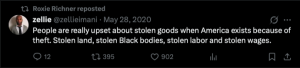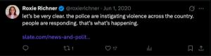 "let's be very clear. the police are instigating violence across the country. people are responding. that's what's happening," Richner posted to X on June 1, 2020. A few days earlier she shared a post which read, "People are really upset about stolen goods when America exists because of theft. Stolen land, stolen Black bodies, stolen labor and stolen wages."