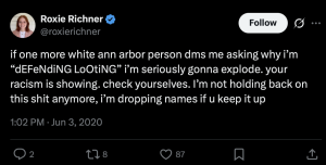 "if one more white ann arbor person dms me asking why i’m ‘dEFeNdiNG LoOtiNG’ i’m seriously gonna explode. your racism is showing. check yourselves. I’m not holding back on this shit anymore, i’m dropping names if u keep it up," Richner wrote on X on June 3, 2020.