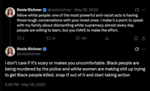 "fellow white people: one of the most powerful anti-racist acts is having those tough conversations with your loved ones. I make it a point to speak with my family about dismantling white supremacy almost every day," Richner wrote. "Black people are being murdered by the police and white women are making shit up trying to get Black people killed. snap tf out of it and start taking action."