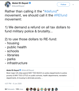 El-Sayed has deleted tweets describing police departments as "standing armies" and suggesting that left-wing activists should rebrand the "#defund" movement to the "#REfund" movement and "demand a refund on all tax dollars to fund military police & brutality." Richner shared the latter post to X.