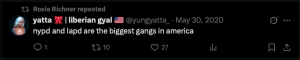 Richner also boosted social media posts arguing that racism is "a systemic virus plaguing police departments across the US," that the New York City and Los Angeles police departments are "the biggest gangs in America," and that "Racist violence and police murder are inherent to capitalism."