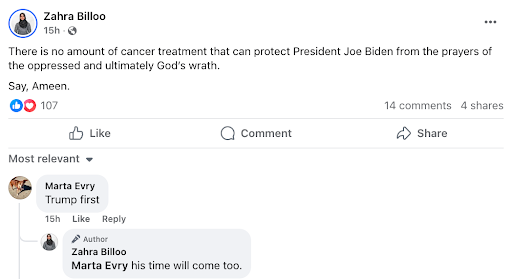 Zahra Billoo, the executive director of CAIR's San Francisco branch, said on social media that Biden’s cancer diagnosis was "God’s wrath" for his handling of the Israel-Hamas war. Billoo added that she's praying Biden’s cancer will be "as aggressive" as Israel's military actions against Hamas.