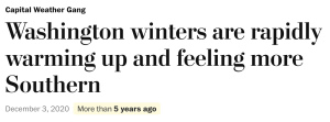 "Thanks mostly to a combination of human-caused climate change and urbanization, winters in Washington are warming hastily and taking on an entirely new character," wrote "climate reporter" Ian Livingston and "climate editor" Andrew Freedman in their December 2020 piece headlined, "Washington winters are rapidly warming up and feeling more Southern." "Our winter climate is on a southbound journey, with nothing in the way. … The frequency of bitterly cold winter days is in decline."