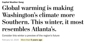 Months earlier, Jason Samenow, another writer on the Post’s climate team—which at its height was staffed by more than 30 people—came to a similar conclusion. He penned a piece headlined, "Global warming is making Washington's climate more Southern. This winter, it most resembles Atlanta's."
