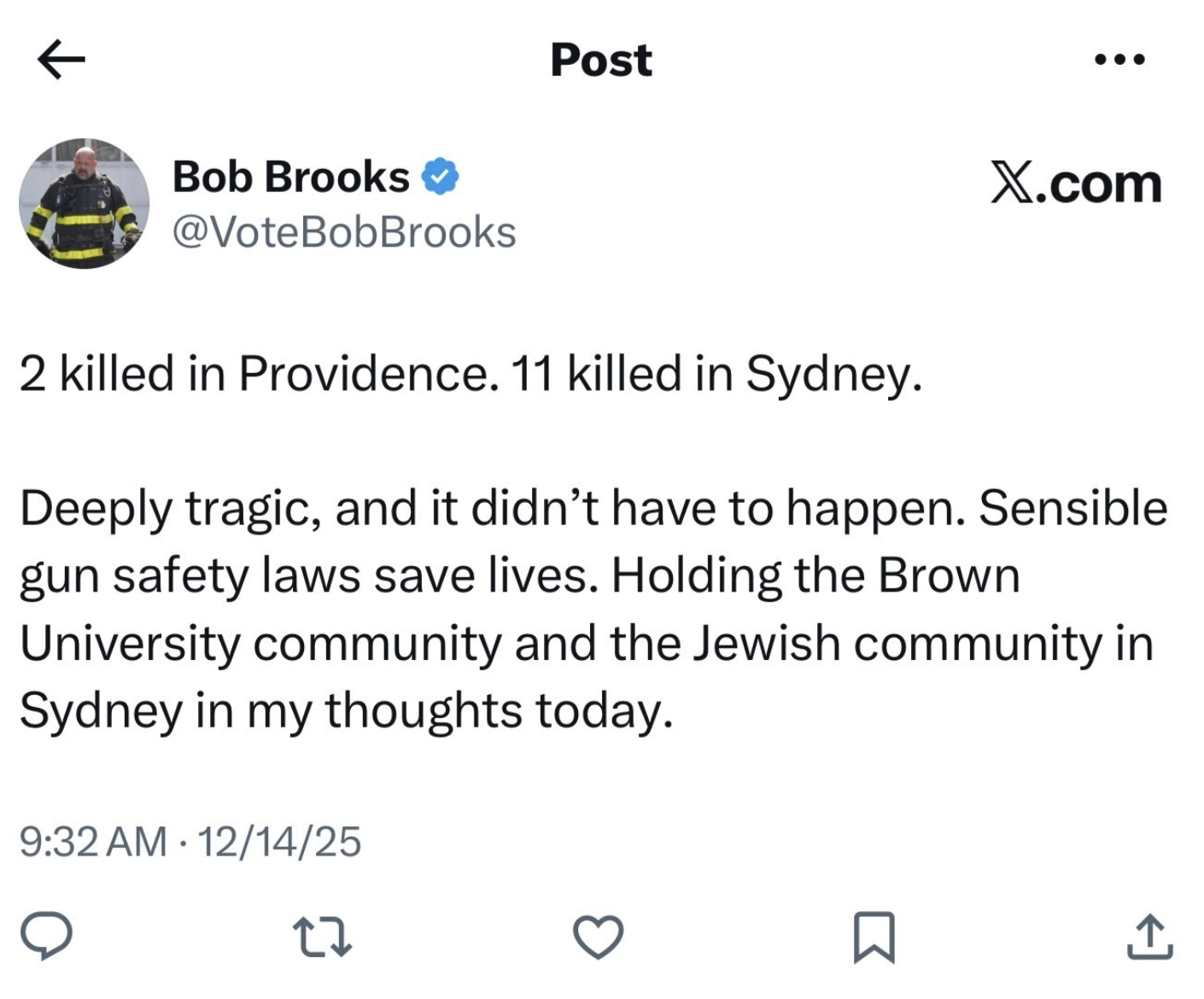 "2 killed in Providence," Bob Brooks, a Democrat running for Pennsylvania’s Seventh Congressional District against Republican incumbent Ryan Mackenzie, posted at 9:32 a.m. on Sunday. "11 killed in Sydney. Deeply tragic, and it didn’t have to happen. Sensible gun safety laws save lives. Holding the Brown University community and the Jewish community in Sydney in my thoughts today."