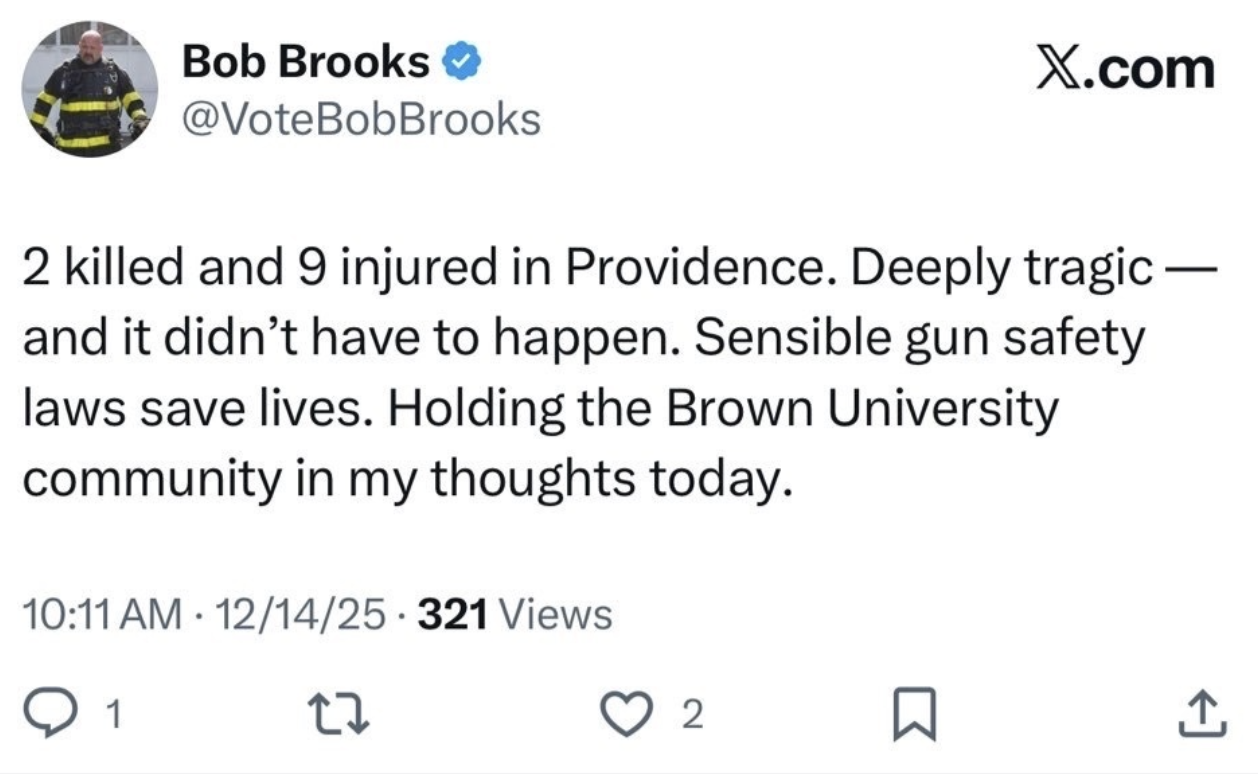"2 killed and 9 injured in Providence," Brooks wrote at 10:11 a.m. "Deeply tragic — and it didn’t have to happen. Sensible gun safety laws save lives. Holding the Brown University community in my thoughts today."