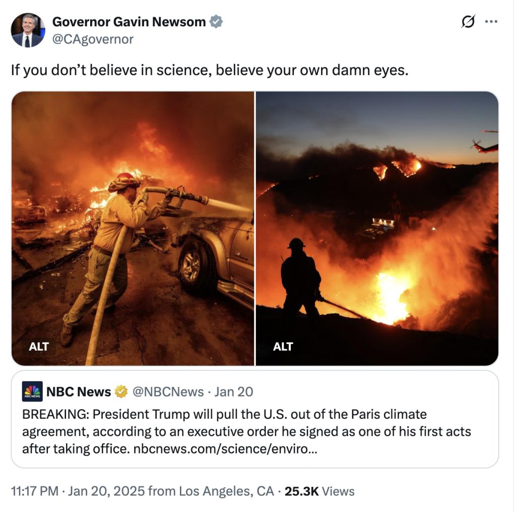 "If you don’t believe in science, believe your own damn eyes," Gov. Gavin Newsom (D., Calif.) wrote in a post with photographs of the Los Angeles fire. The post came in response to news that President Donald Trump would withdraw the United States from the Paris Climate Accords in January.