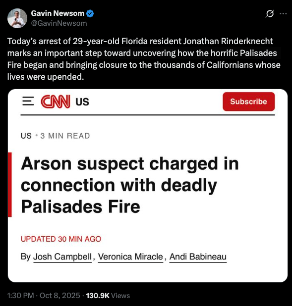 After prosecutors announced the charge against Rinderknecht on Wednesday, Newsom wrote it "marks an important step toward uncovering how the horrific Palisades Fire began."
