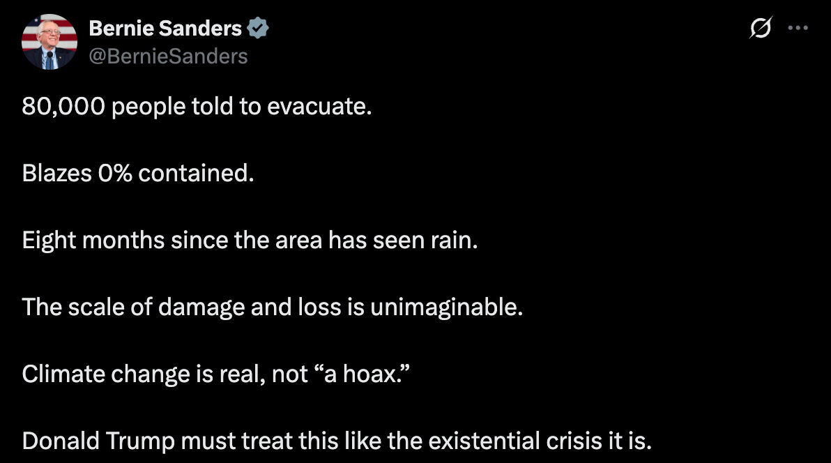 "The scale of damage and loss is unimaginable," Sen. Bernie Sanders (I., Vt.) wrote on X amid the fire. "Climate change is real, not 'a hoax.' Donald Trump must treat this like the existential crisis it is."![]()