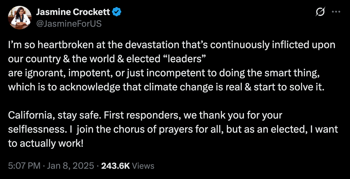 Rep. Jasmine Crockett, (D., Texas) chimed in as well: "I’m so heartbroken at the devastation that’s continuously inflicted upon our country & the world & elected ‘leaders’ are ignorant, impotent, or just incompetent to doing the smart thing, which is to acknowledge that climate change is real & start to solve it."