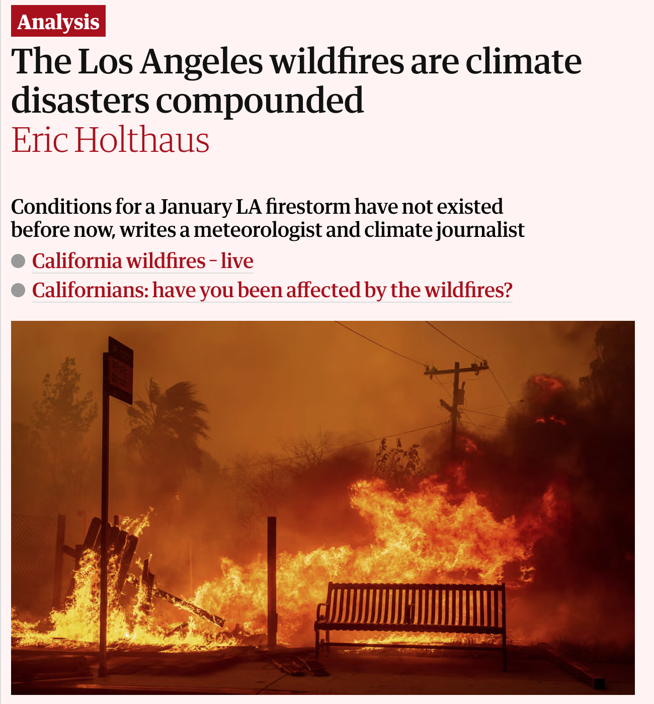Those stories had headlines like the Guardian's "The Los Angeles wildfires are climate disasters compounded," the Los Angeles Times's "How climate change worsened the most destructive wildfires in L.A. history," and NBC News's "How weather driven by climate change helped fuel the Southern California fires."