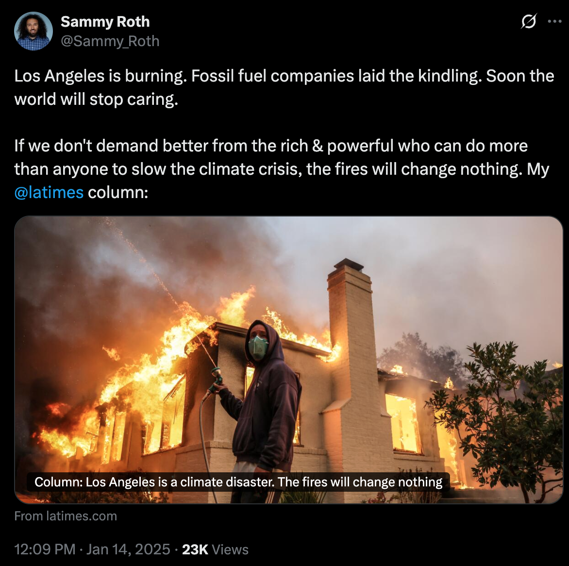 Los Angeles Times columnist Sammy Roth placed the blame squarely on oil companies: "Los Angeles is burning. Fossil fuel companies laid the kindling. Soon the world will stop caring. If we don't demand better from the rich & powerful who can do more than anyone to slow the climate crisis, the fires will change nothing."