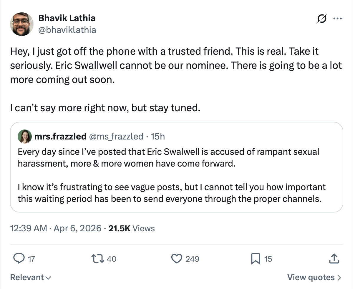 "Take it seriously. Eric Swallwell [sic] cannot be our nominee," he wrote.