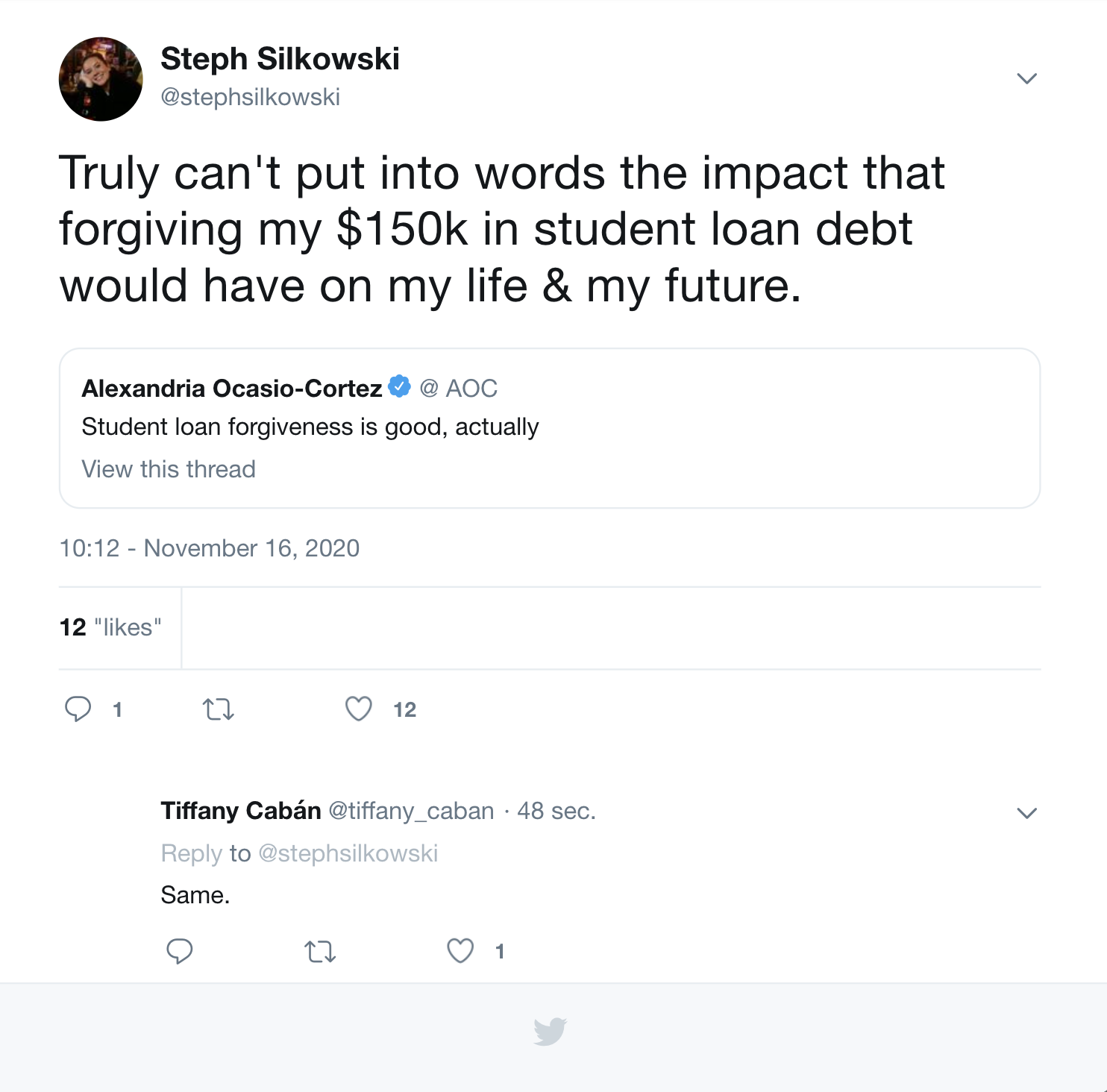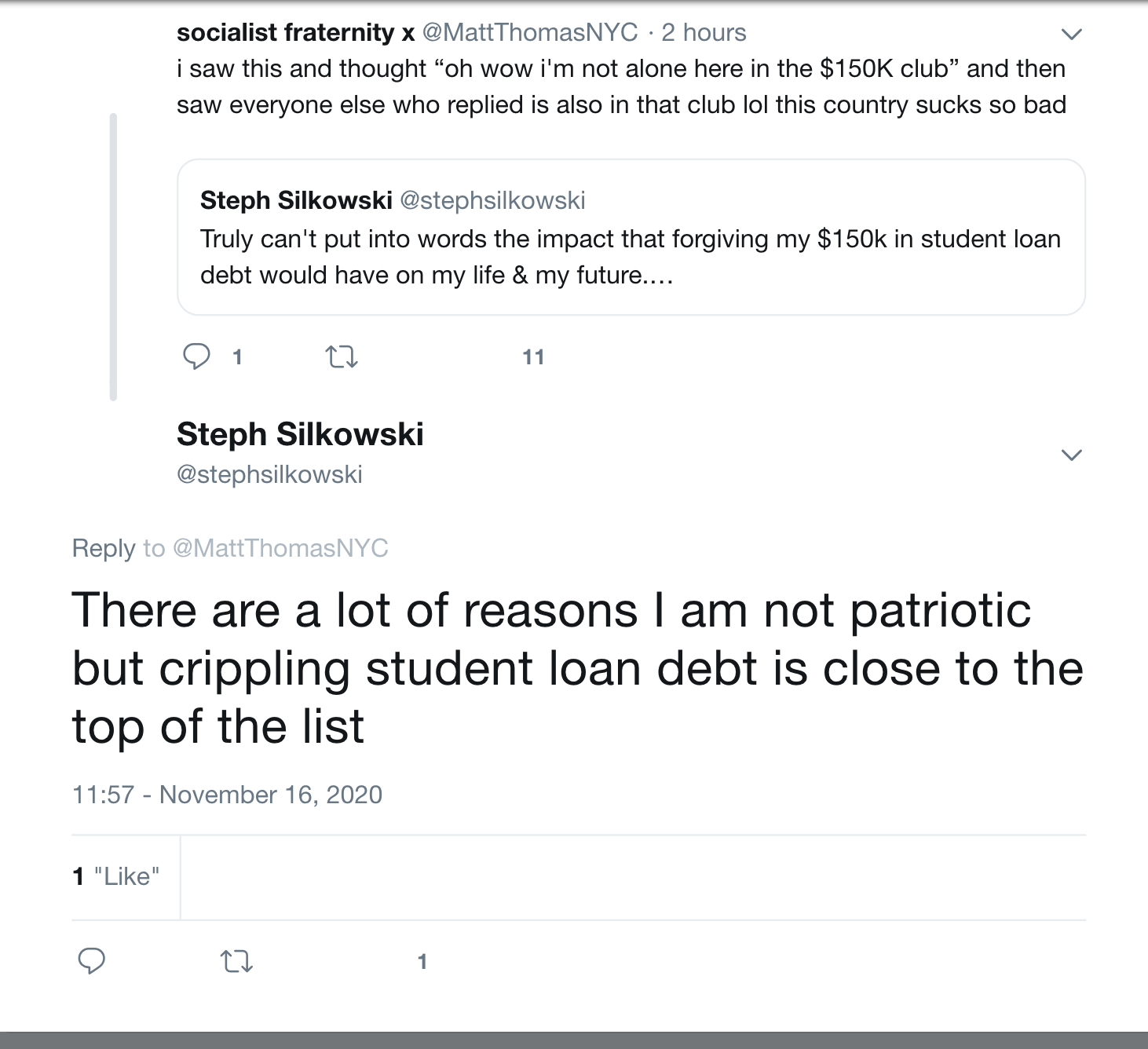 "There are a lot of reasons I am not patriotic but crippling student loan debt is close to the top of the list," she posted in November 2020.