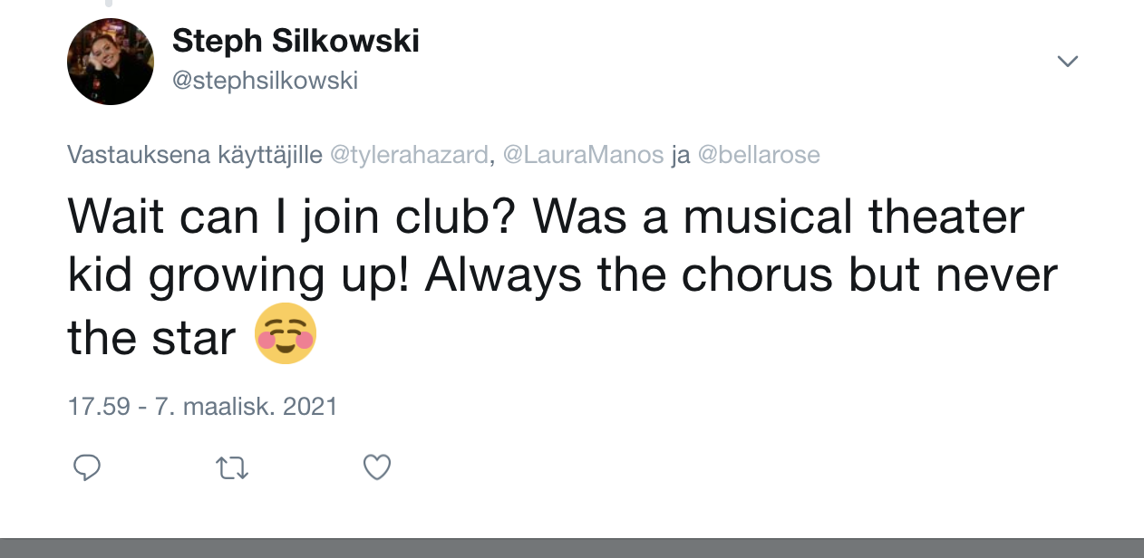 Over the years, Silkowski has discussed another interest of hers: musical theater, noting that she was "always the chorus but never the star."