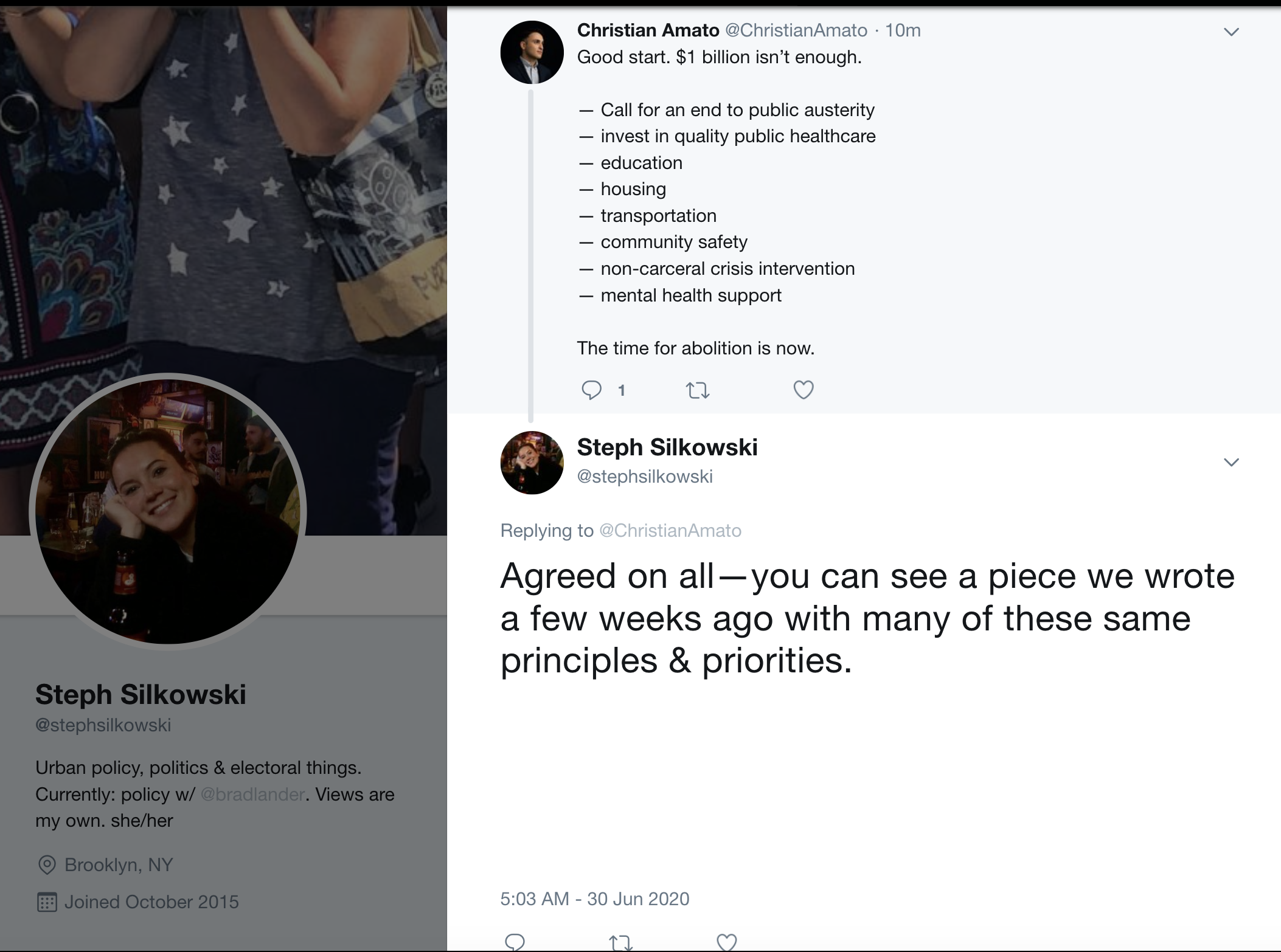 Ahead of the 2021 City Council elections, Silkowski wrote favorably of then-candidate Shahana Hanif (D.) and her plans for "defunding police" and "abolition."