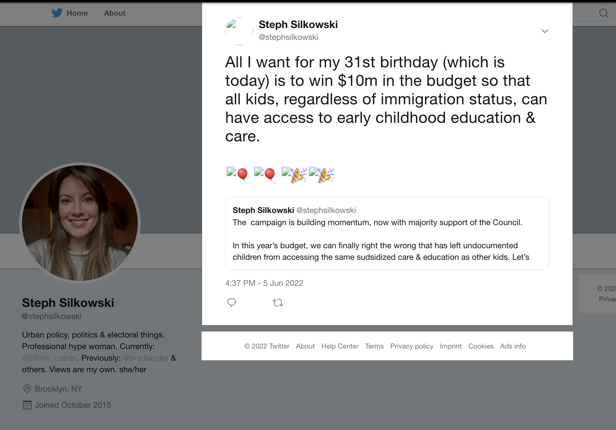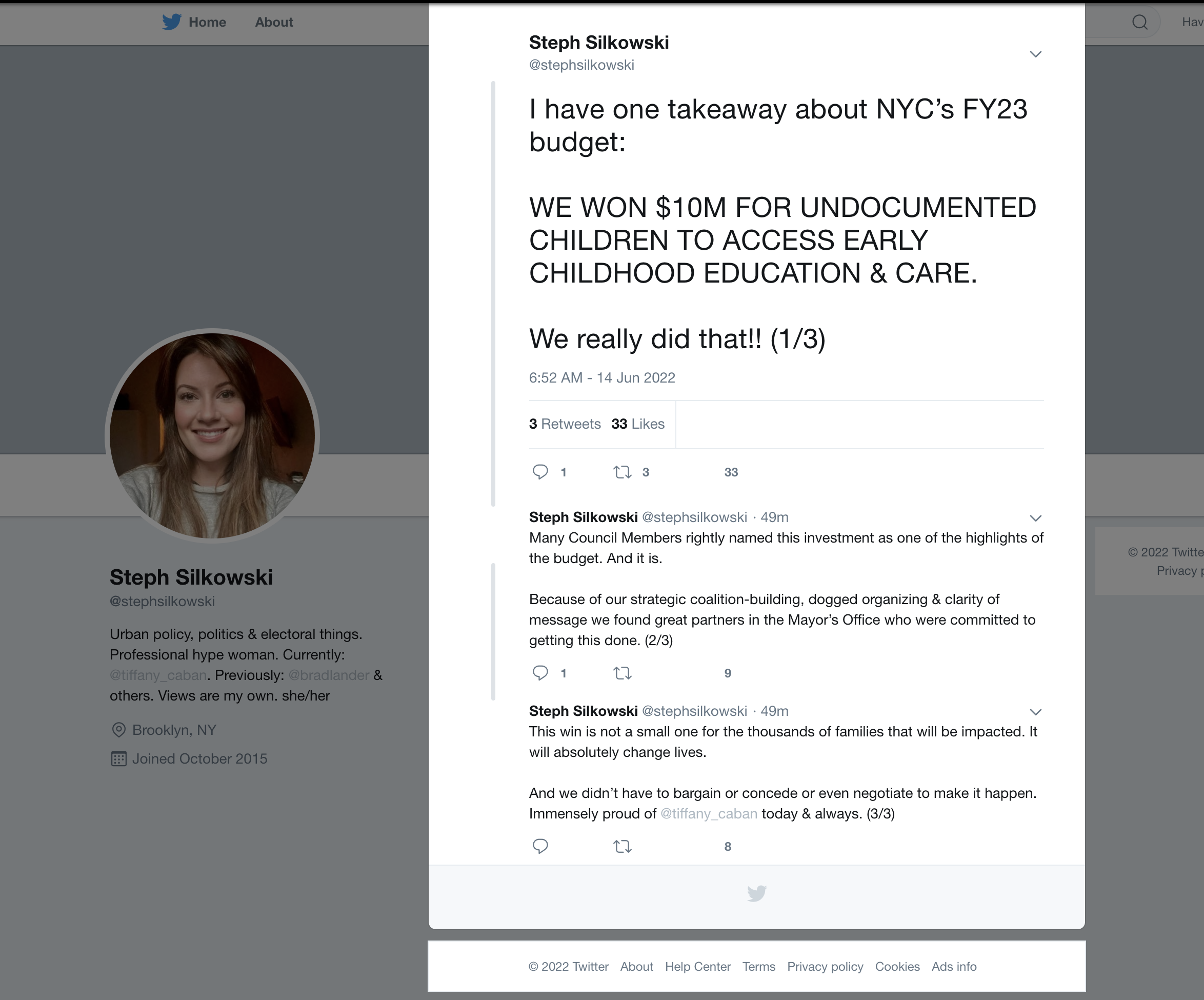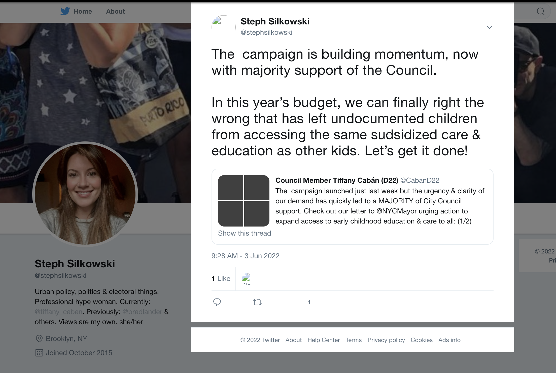 "WE WON $10M FOR UNDOCUMENTED CHILDREN TO ACCESS EARLY CHILDHOOD EDUCATION & CARE," Silkowski blasted in an all-caps post from June 2022.