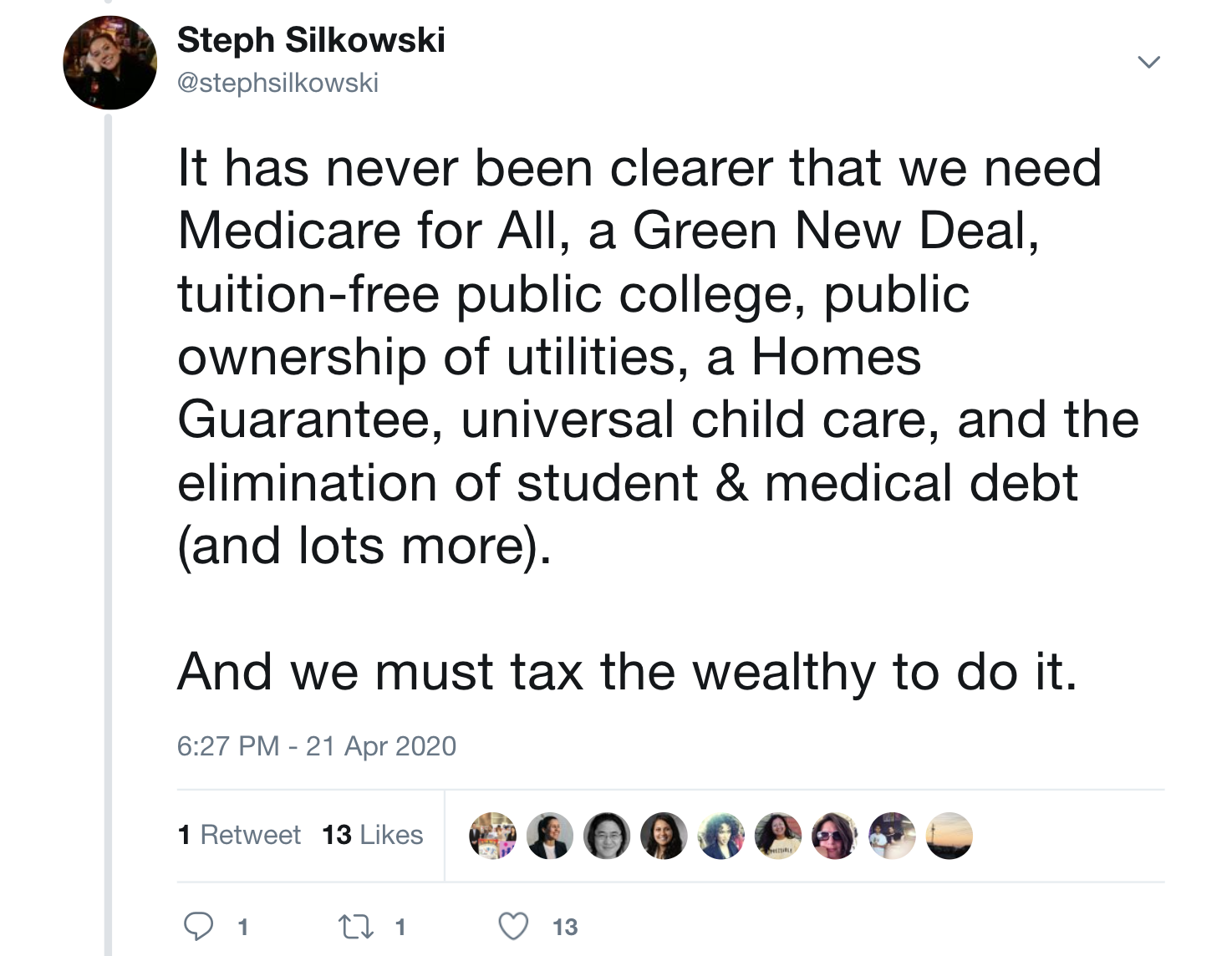 "It has never been clearer that we need Medicare for All, a Green New Deal, tuition-free public college, public ownership of utilities, a Homes Guarantee, universal child care, and the elimination of student & medical debt (and lots more)," she wrote in April 2020. "And we must tax the wealthy to do it."