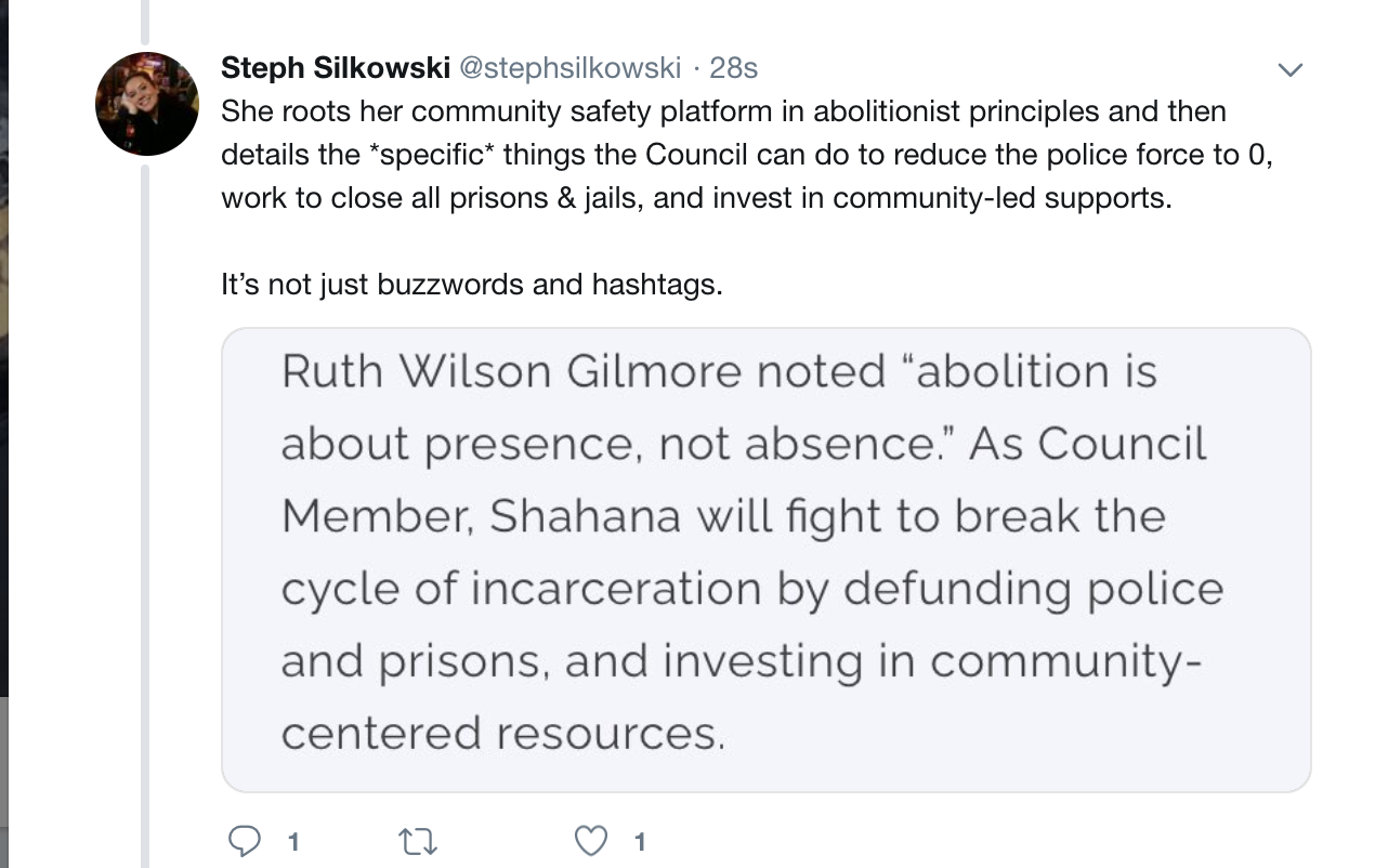 "She roots her community safety platform in abolitionist principles and then details the *specific* things the Council can do to reduce the police force to 0, work to close all prisons & jails, and invest in community-led supports," Silkowski posted.