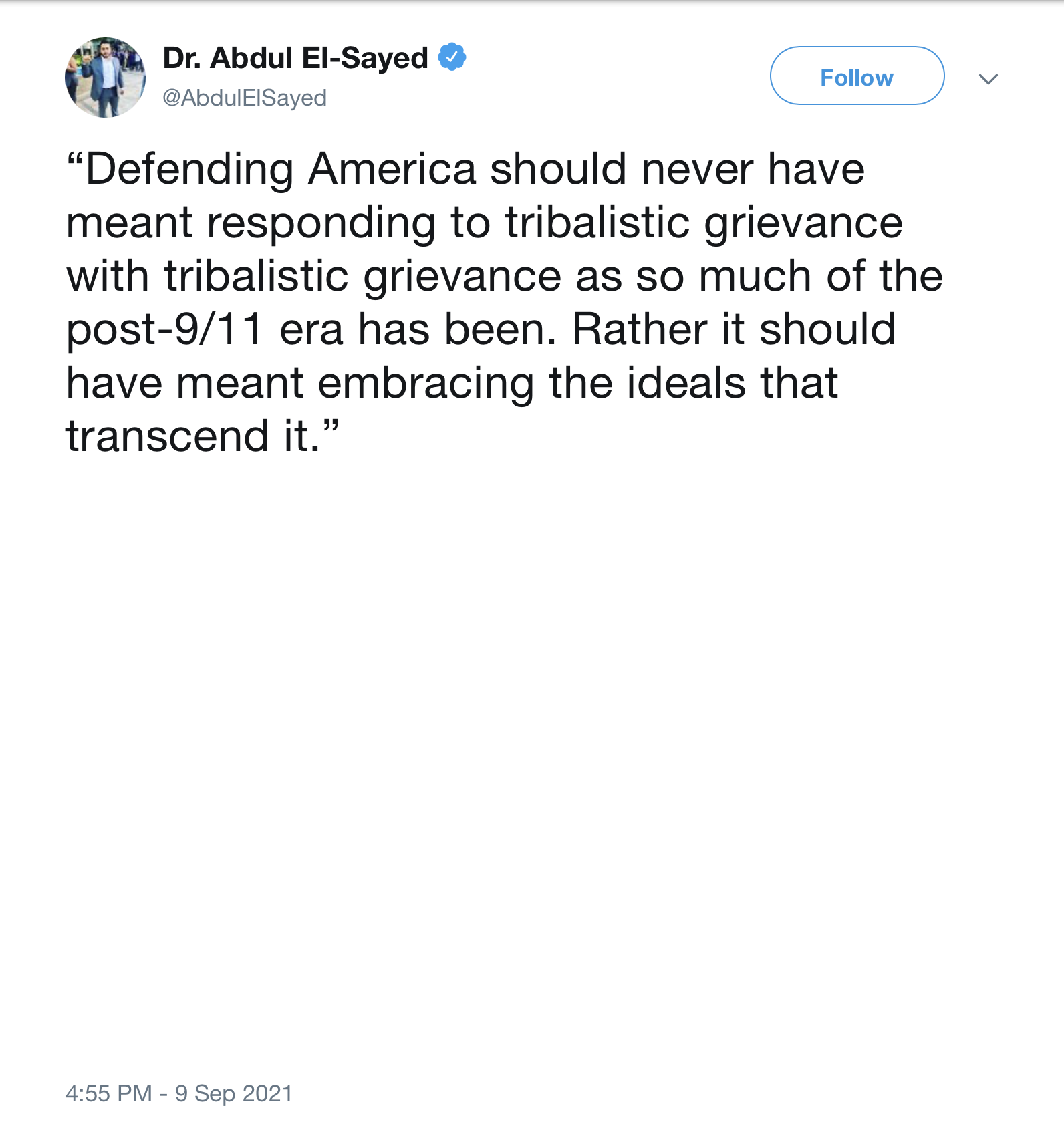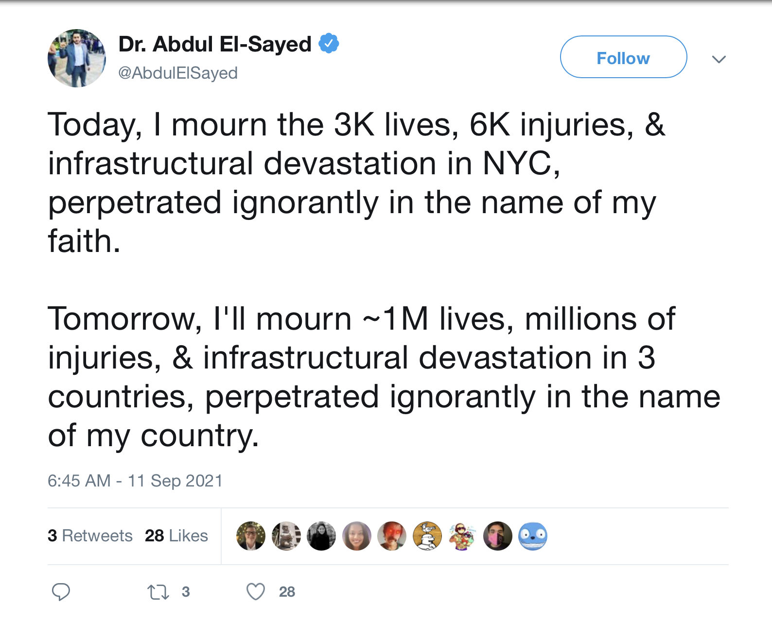 "Today, I mourn the 3K lives, 6K injuries, & infrastructural devastation in NYC, perpetrated ignorantly in the name of my faith," El-Sayed wrote on the 20th anniversary of the terror attack that claimed nearly 3,000 innocent lives. "Tomorrow, I'll mourn ~1M lives, millions of injuries, & infrastructural devastation in 3 countries, perpetrated ignorantly in the name of my country."