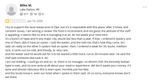 "I ordered 6 oysters, and one of them, didn’t have an oyster," that reviewer noted. "I told the waiter, and she told me, that’s how they come."