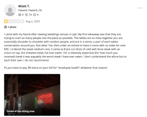 "For a relatively expensive (for how much you received) steak it was arguably the worst steak I have ever eaten," wrote one annoyed Yelp reviewer, who also noted an added "3% extra on your bill for ‘employee health’ whatever that means!"