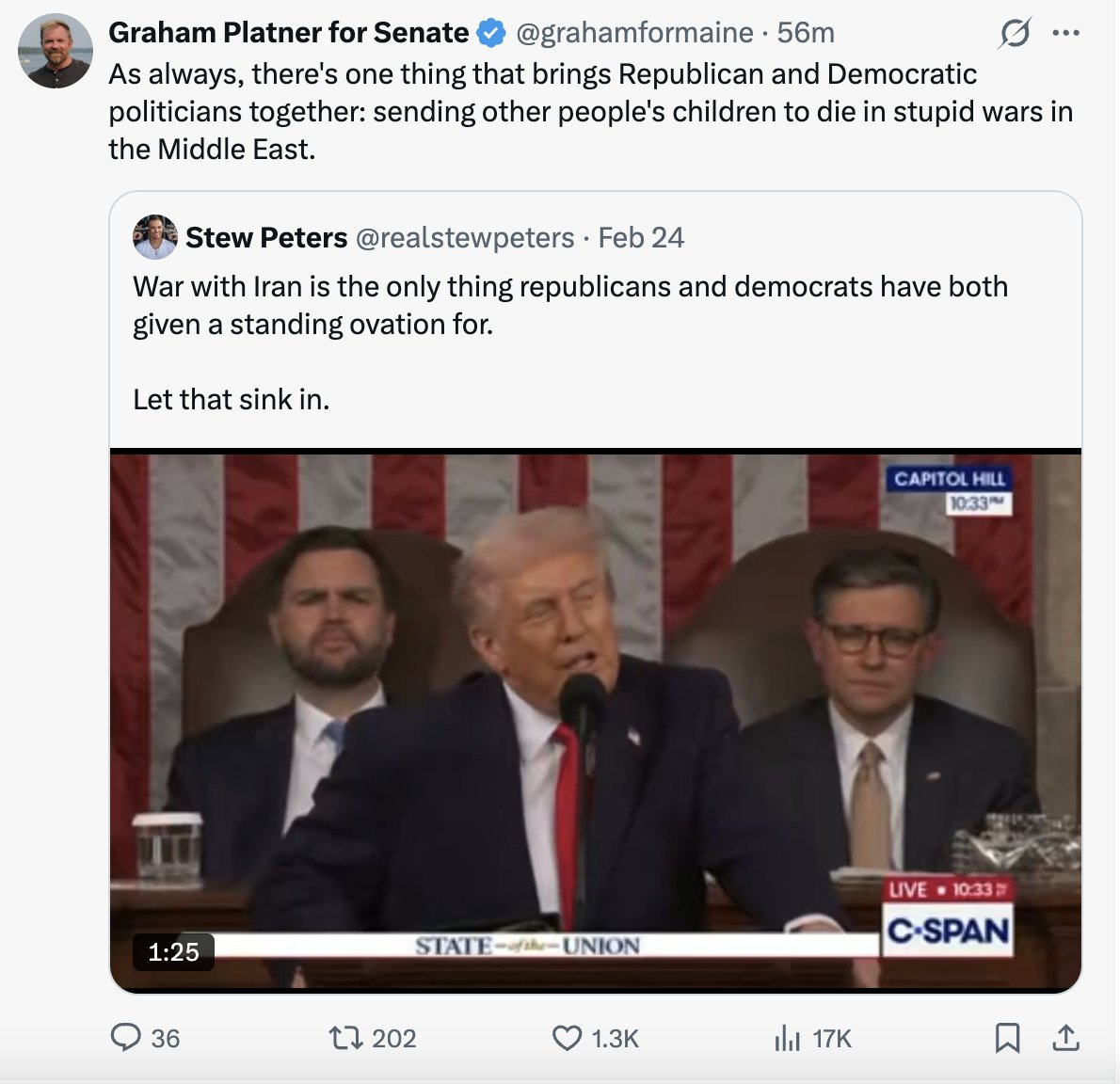 Platner, who is running to unseat Sen. Susan Collins (R.), echoed those remarks, accusing both parties of "sending other people’s children to die in stupid wars in the Middle East."