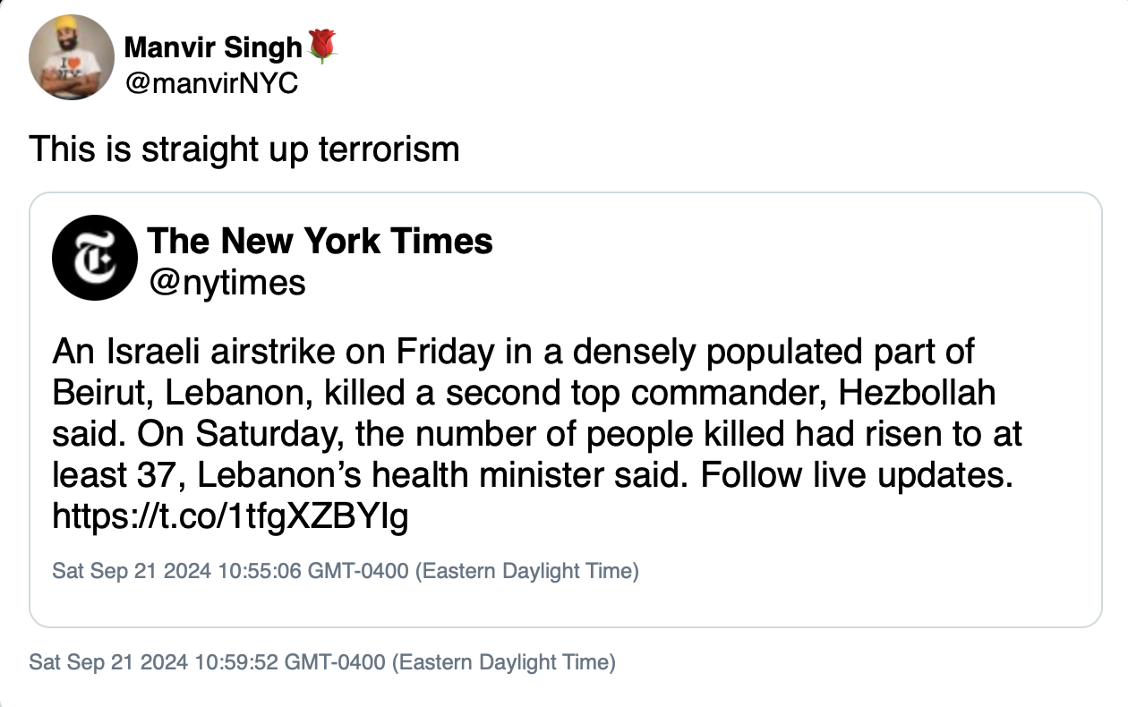 Another new hire, Manvir Singh, is now serving as a senior policy analyst in Mamdani's administration. Like many other Mamdani appointees, Singh deleted his X account after old posts—including one in support of defunding the police—came to light. A Free Beacon review of his old X account found several other extremist posts, including one in which Singh accused Israel of committing "terrorism" with its operations against Hezbollah in Lebanon.