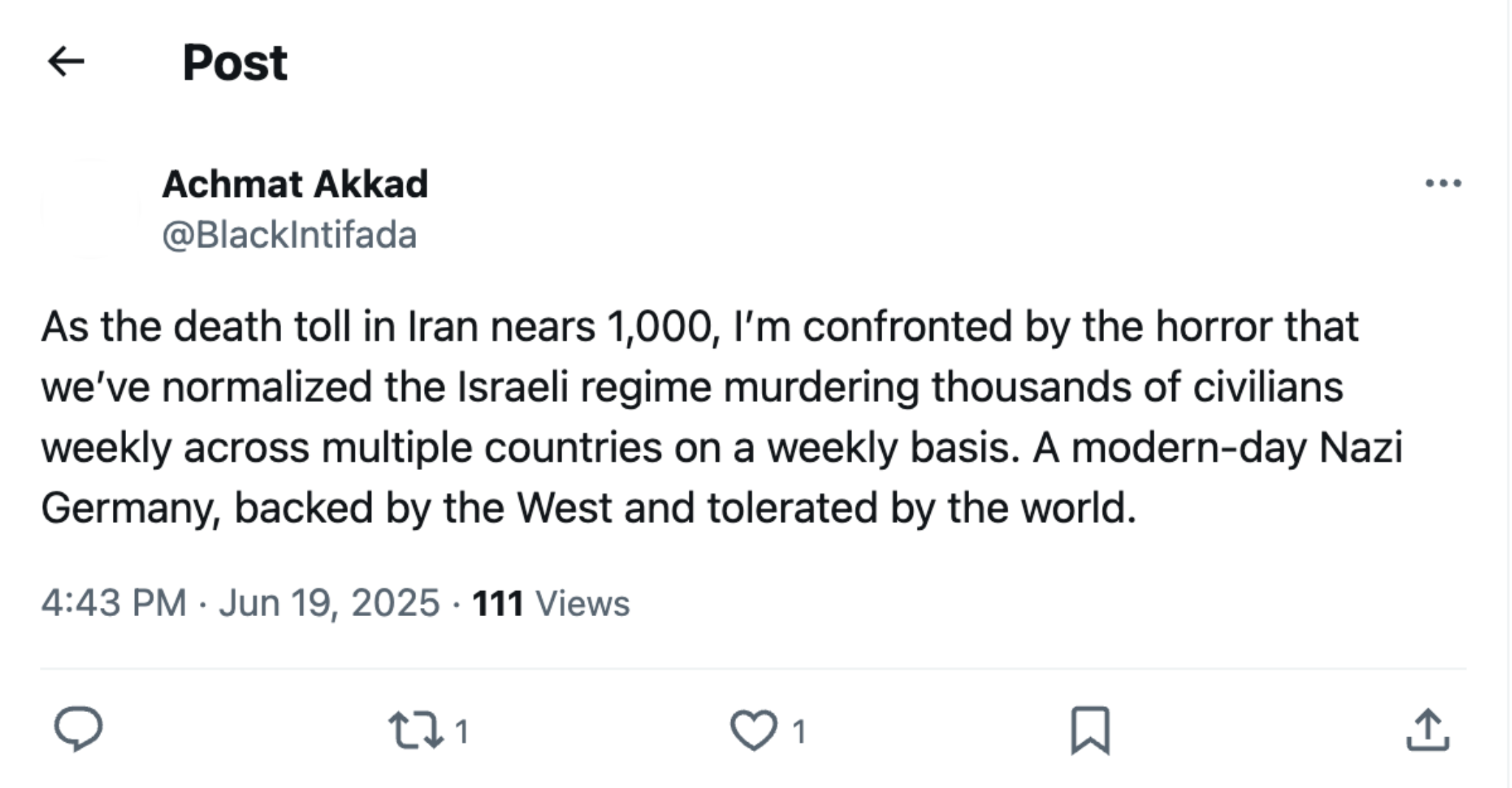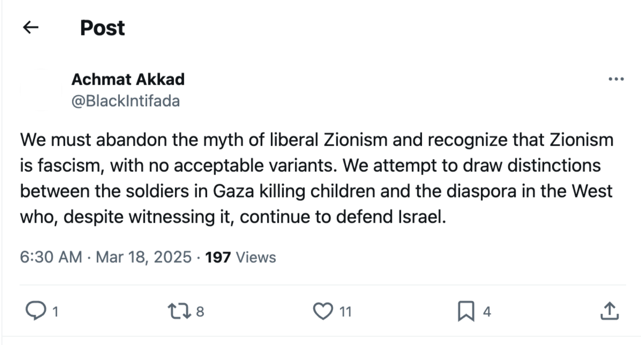 Akkad wrote in a June 2025 post on X that Israel is a "modern-day Nazi Germany" and in a May 2025 post that "Zionism is fascism."