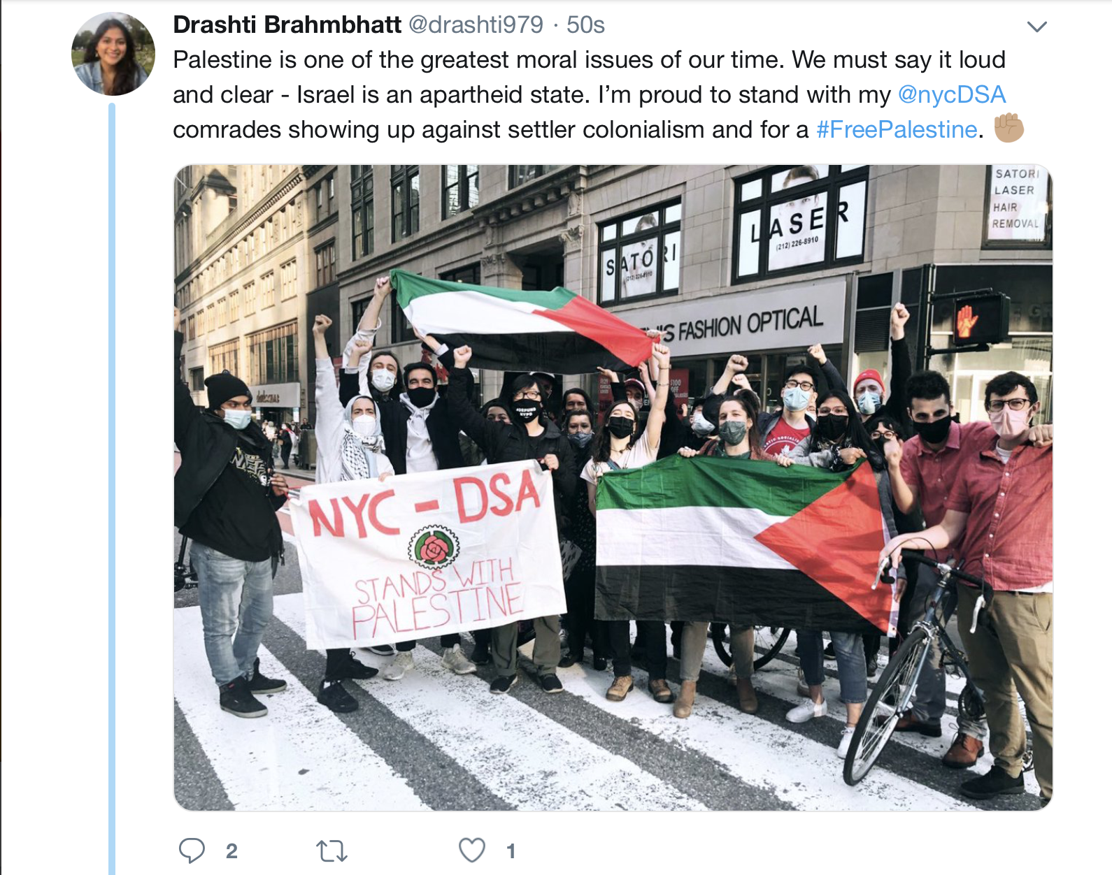 Also on Mamdani's staff is Drashti Brahmbhatt, an adviser to the mayor for "100 Day Planning and Implementation." A member of the Democratic Socialists of America since at least 2021, Brahmbhatt has a history of demonizing Israel since her time in college. While a student at Brown University, Brahmbhatt was a leader on campus calling for the university to divest from companies that do business within the Jewish state. In a since-deleted X post from May 2021, she wrote, "Palestine is one of the greatest moral issues of our time," adding that "Israel is an apartheid state."