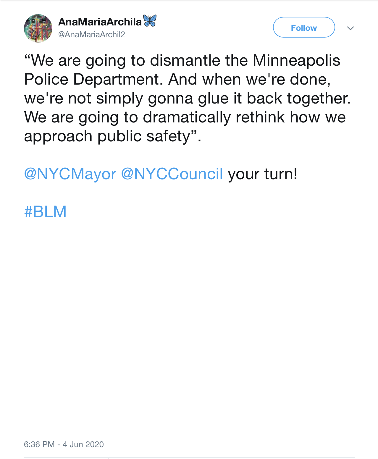 "It's when the police arrives, in riot gear and batons, that the violence begins," Archila said in a third since-deleted missive that also included the words "#DefundNYPD."