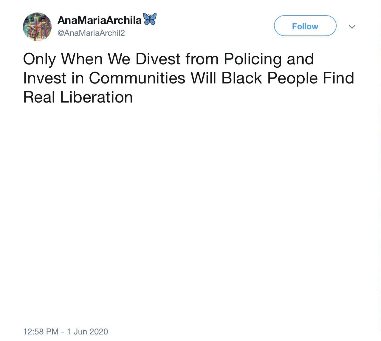 "Only When We Divest from Policing and Invest in Communities Will Black People Find Real Liberation," she wrote in another deleted X post that month.
