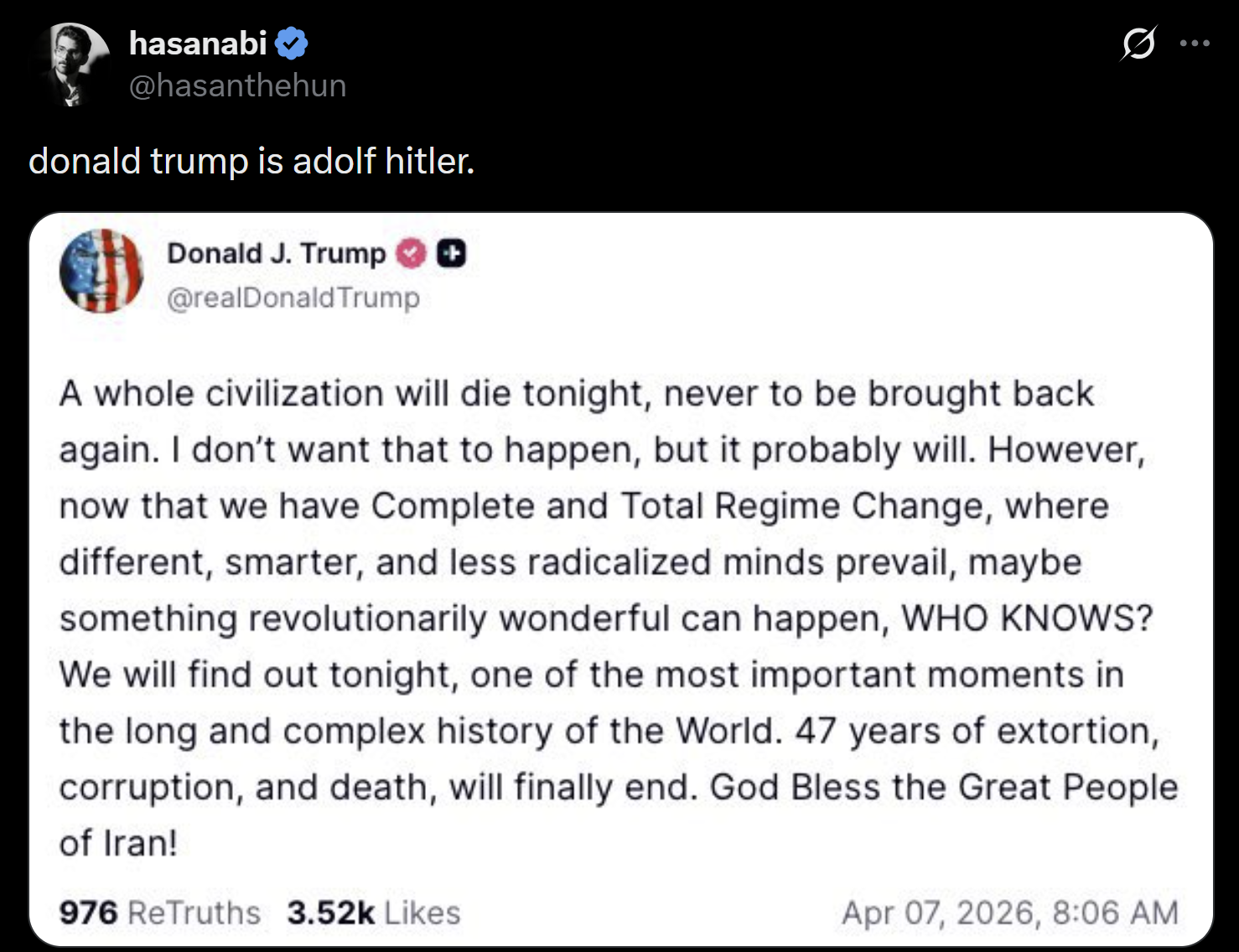 Just hours before the rallies, however, El-Sayed appeared to agree with an X post from Piker reading, "donald trump is adolf hitler." Piker's statement came in response to Trump's threat to bomb Iranian infrastructure sites and destroy "a whole civilization" if the Islamic Republic did not agree to a ceasefire deal by 8 p.m. on Tuesday. Trump announced a ceasefire hours ahead of that deadline as El-Sayed and Piker campaigned at Michigan State.