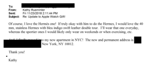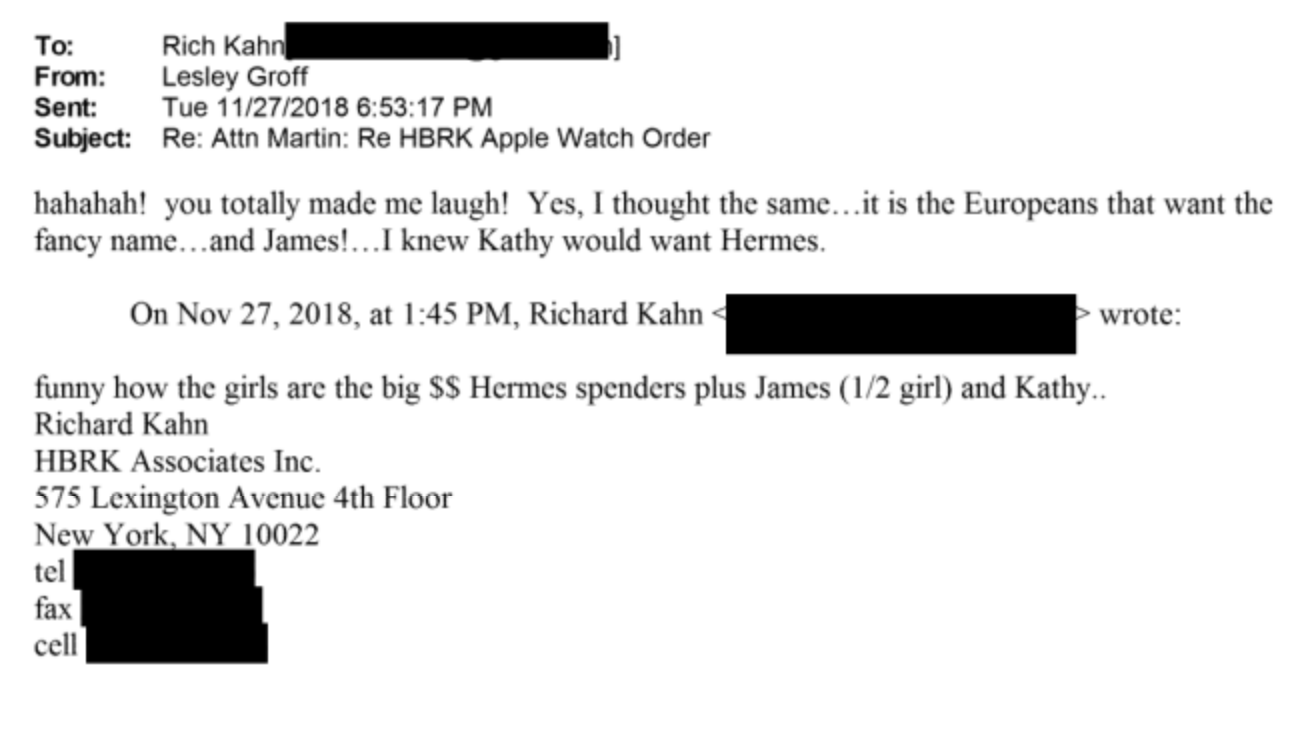 Some two years later, in November 2018, Epstein bought Ruemmler an Hermes edition of the Apple Watch, which retails for $1,300. Emails show that Ruemmler asked for a specific model and watch band and said the gift was "so sweet of Jeffrey!"
