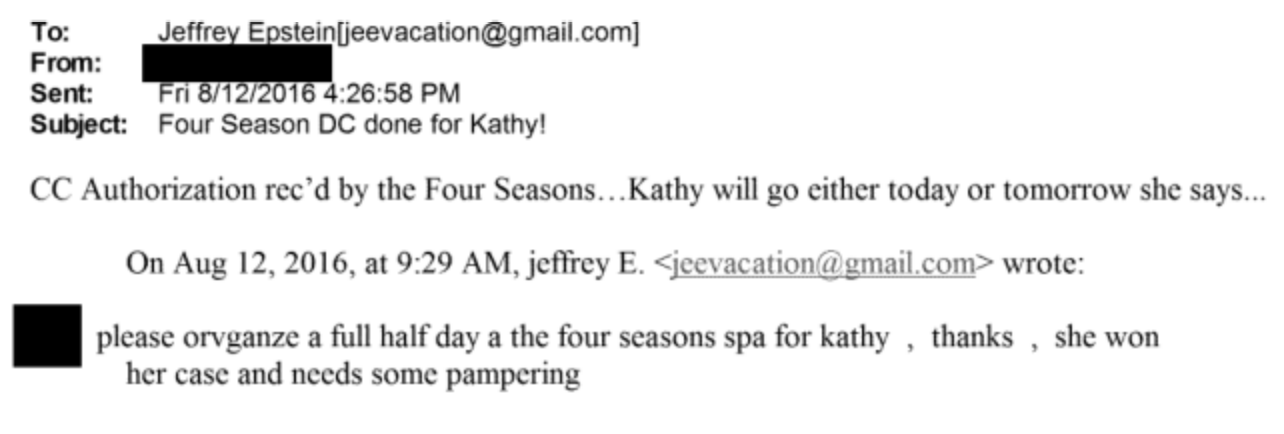 Epstein also appeared to be attuned to Ruemmler's schedule and professional achievements. He booked a "full half day" spa appointment at the Four Seasons Hotel in Georgetown for Ruemmler in August 2016, writing to an associate, "she won her case and needs some pampering." The associate responded with a credit card authorization form and said, "Kathy will go either today or tomorrow she says…" A massage and facial at the luxury hotel can cost upwards of $1,000.