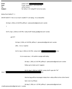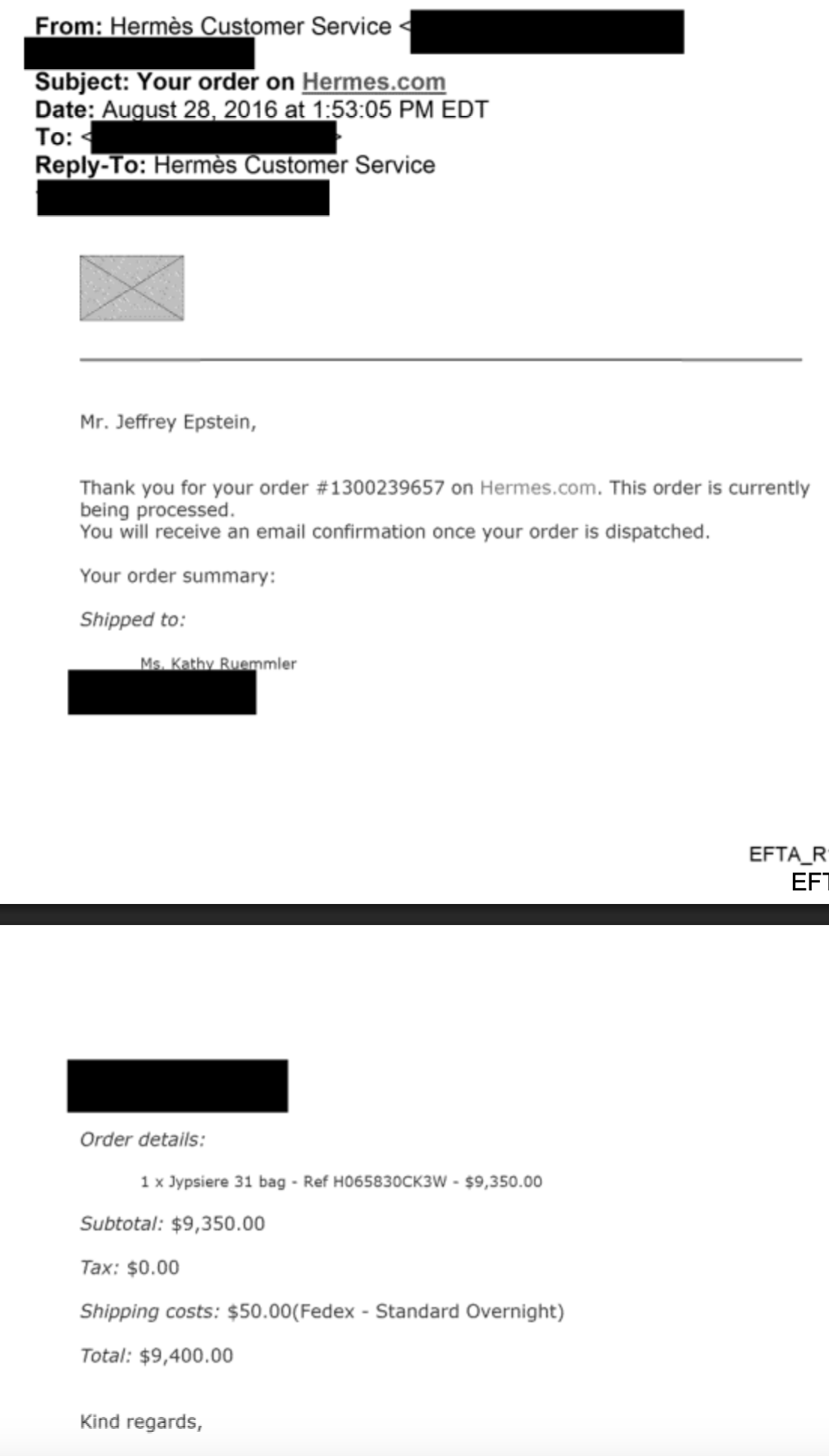The priciest gift likely came in August 2016, when Epstein purchased Ruemmler a $9,400 handbag from the French luxury brand Hermes. Epstein took a particular interest in ensuring Ruemmler received the bag, directing one of his associates, Lesley Groff, to "confirm receipt with Kathy" and "follow up to make sure it happens." When Ruemmler received the bag, she wrote to Groff, "OH MY GOD!!!!! He is in so much trouble!!!! I am dying. It is so beautiful," as Groff relayed to Epstein. Used versions of the same bag—a Jypsiere 31—now sell for around $5,000.