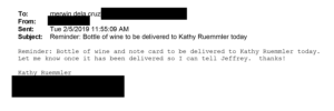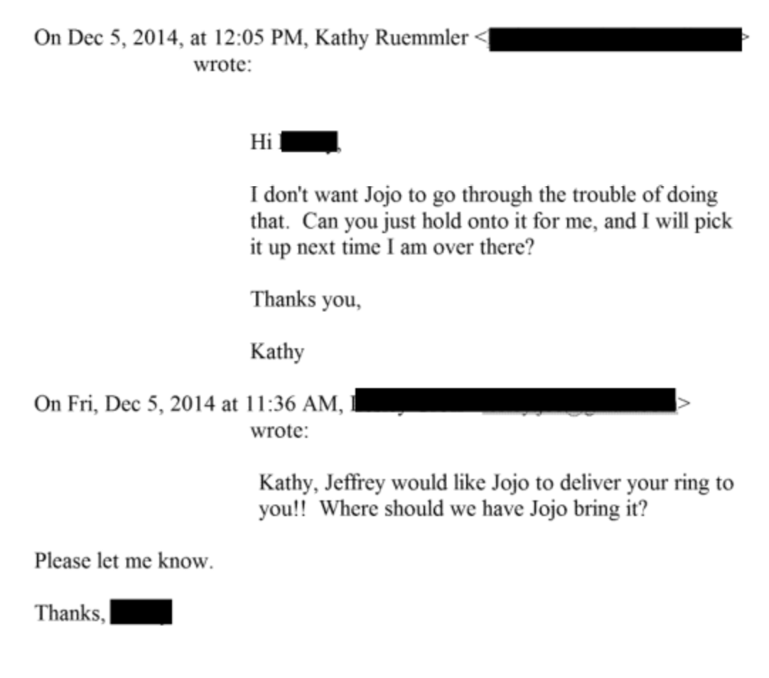 Epstein appeared to provide other gifts of unknown value to Ruemmler. In December 2014, an Epstein associate emailed Ruemmler to inform her that Epstein planned to send his housekeeper to "deliver your ring to you!!" In February 2019, an Epstein associate sent a reminder email to an unidentified individual reading, "Reminder: Bottle of wine and note card to be delivered to Ruemmler today. Let me know once it has been delivered so I can tell Jeffrey."