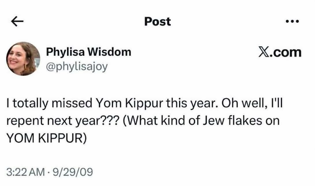 Wisdom once posted about how she "totally missed Yom Kippur," asking, "What kind of Jew flakes on YOM KIPPUR[?]"