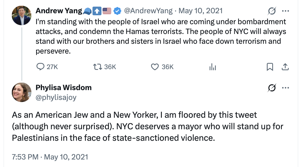 Wisdom, the new leader of the Mayor's Office to Combat Antisemitism, has also expressed anti-Israel views. During the 2021 mayoral race, when Israel came under a barrage of Hamas rocket fire, Wisdom replied to then-mayoral candidate Andrew Yang's statement of solidarity with the Jewish state.