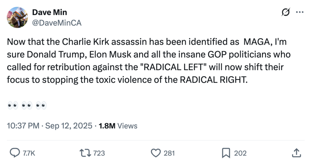 "Now that the Charlie Kirk assassin has been identified as MAGA. I'm sure Donald Trump, Elon Musk and all the insane GOP politicians who called for retribution against the 'RADICAL LEFT' will now shift their focus to stopping the toxic violence of the RADICAL RIGHT," Min, considered one of the more vulnerable House Democrats running for reelection in 2026, wrote in a Friday night X post.
