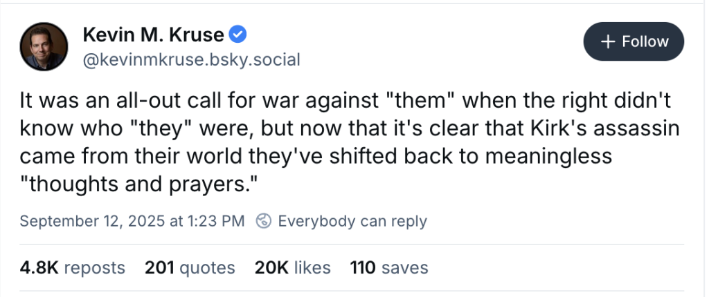 "It was an all-out call for war against 'them' when the right didn't know who 'they' were, but now that it's clear that Kirk's assassin came from their world they've shifted back to meaningless 'thoughts and prayers,'" Princeton professor Kruse, known for his alleged serial plagiarism, wrote on Bluesky Friday afternoon. In another post that day, Kruse wrote: "When they thought he was on the left they blamed the entire left, but now that they know he is on the right they're … blaming the entire left."