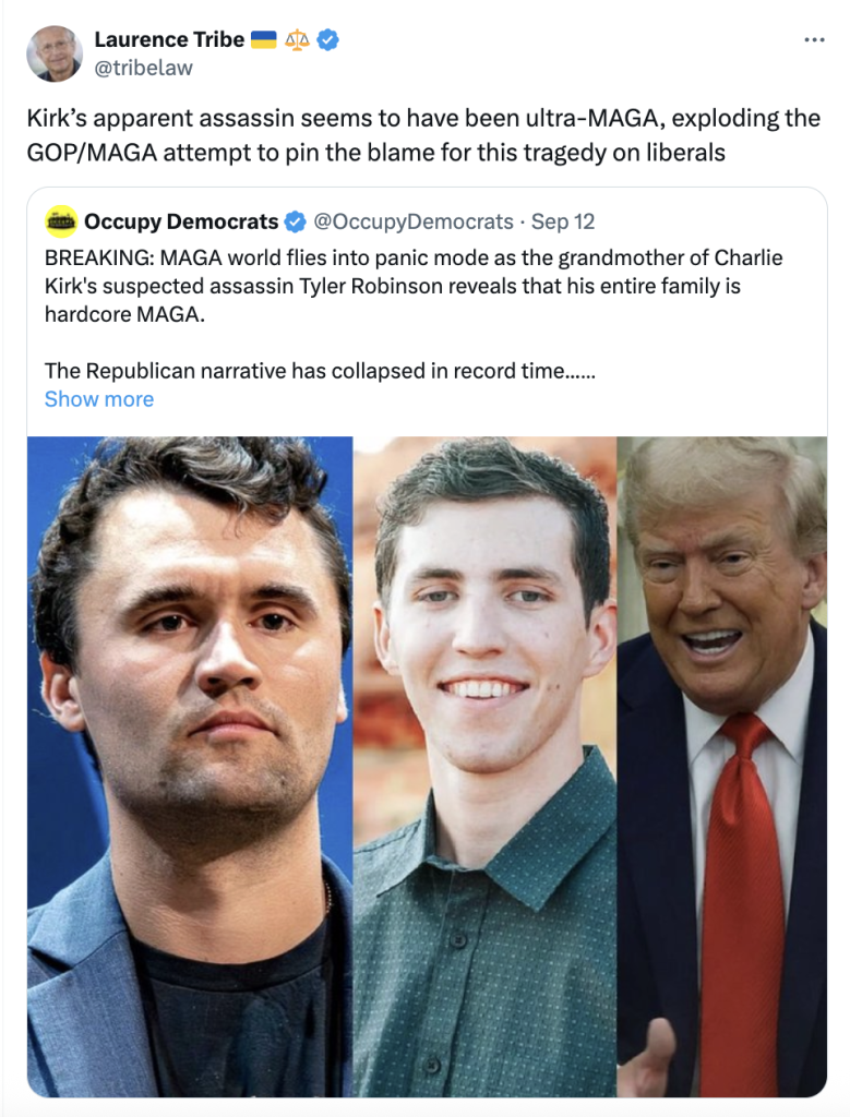 Harvard Law School professor Tribe also lent his credibility to the false flag conspiracy theory. "Kirk's apparent assassin seems to have been ultra-MAGA, exploding the GOP/MAGA attempt to blame this tragedy on liberals," wrote Tribe. He later deleted the tweet, saying it was "premature," but insisted that people calling the shooter "a radical leftist" are "making stuff up."