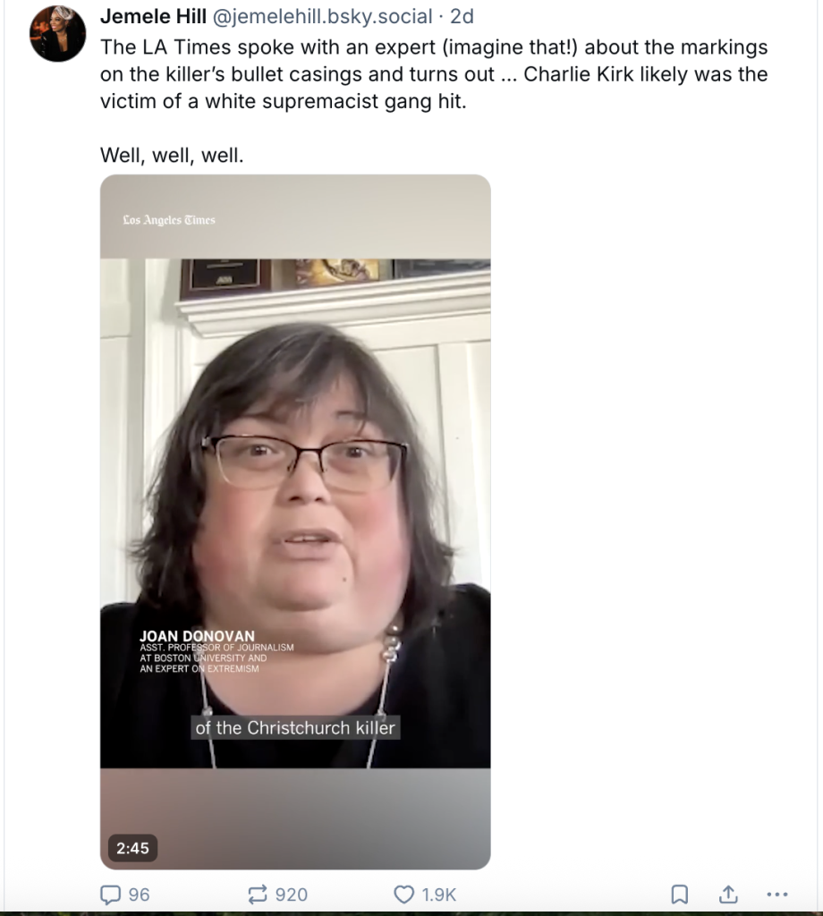 As the conspiracy took over Bluesky on Friday, New York Times columnist Bouie alluded to it while claiming: "man they really didn't give a shit about that guy [Kirk]. [A]s soon as it was clear they couldn't use his death to launch a purge they started to treat it like a nothingburger." His post was reshared more than 4,000 times on the platform.