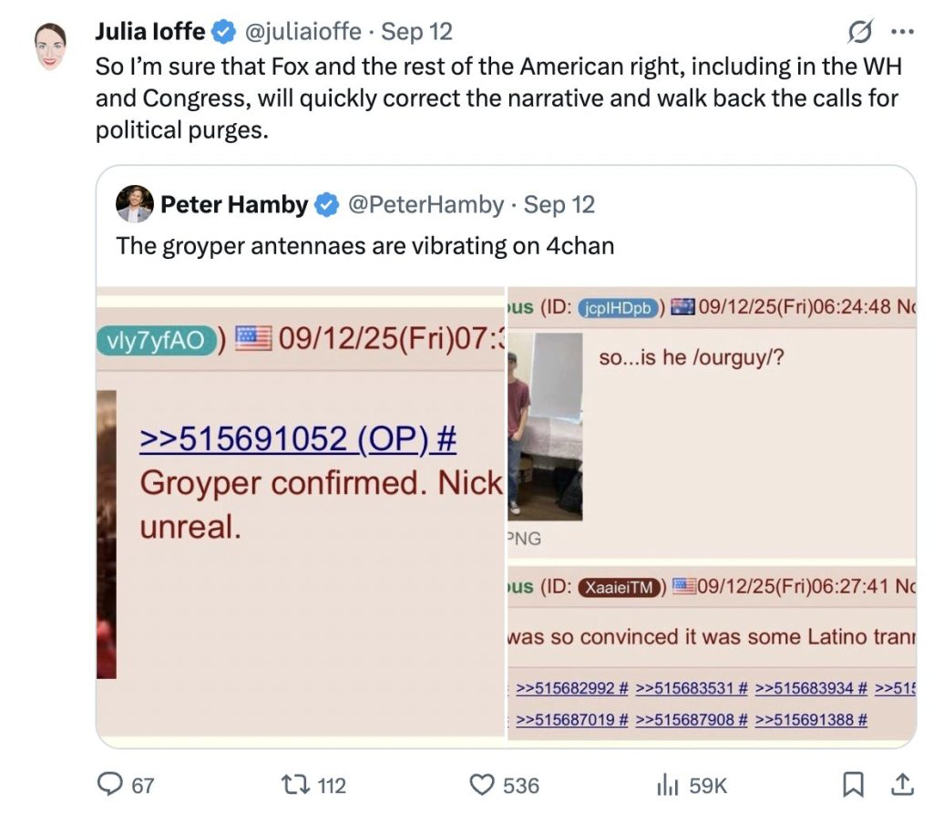 "If you want to understand the 'groyper wars' and the rivalry between Charlie Kirk and Nick Fuentes this is a pretty good backgrounder," Mother Jones editor in chief Jeffery wrote on Saturday, linking to a TikTok video that falsely described the assassination as "right-on-right crime." She added later that day: "The really fucked up thing is that if the guy who killed Kirk really is a groyper, or of some other far-right brain rot cluster, we just cannot rely on Trump's Justice Department to be honest about it."